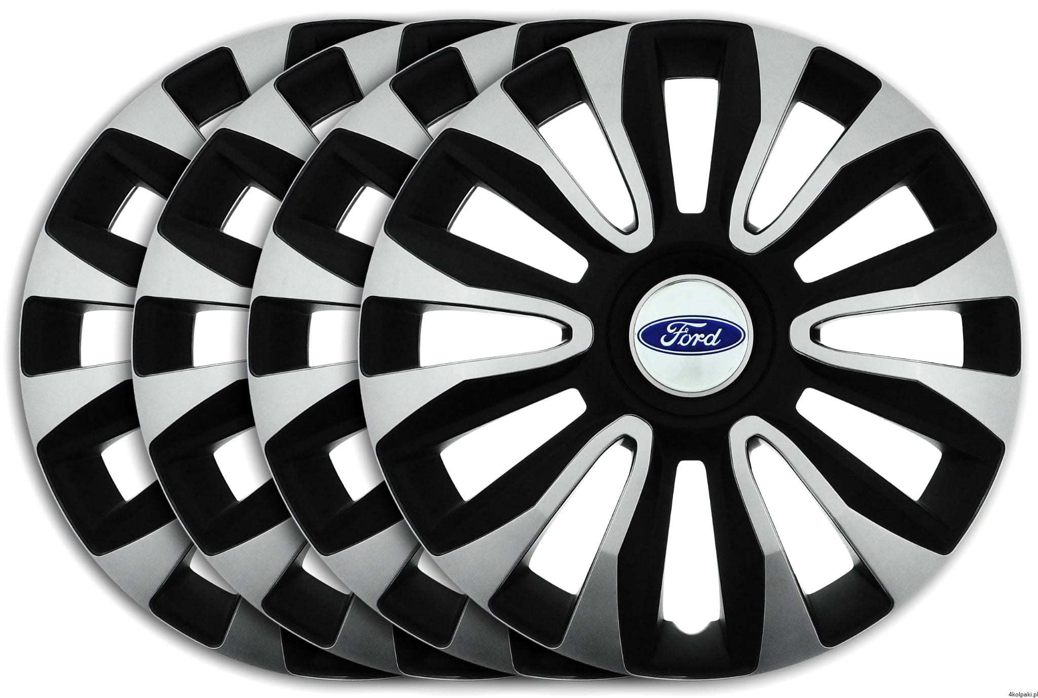 Zestaw czterech (4) nowych 13" KOŁPAKÓW model AVALON CZARNO-SREBRNE z najwyższej jakości EMBLEMATAMI FORD.